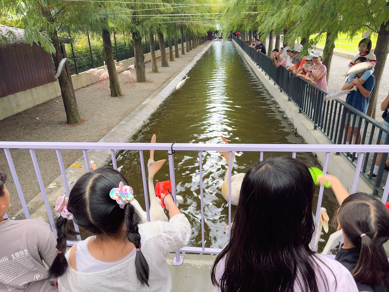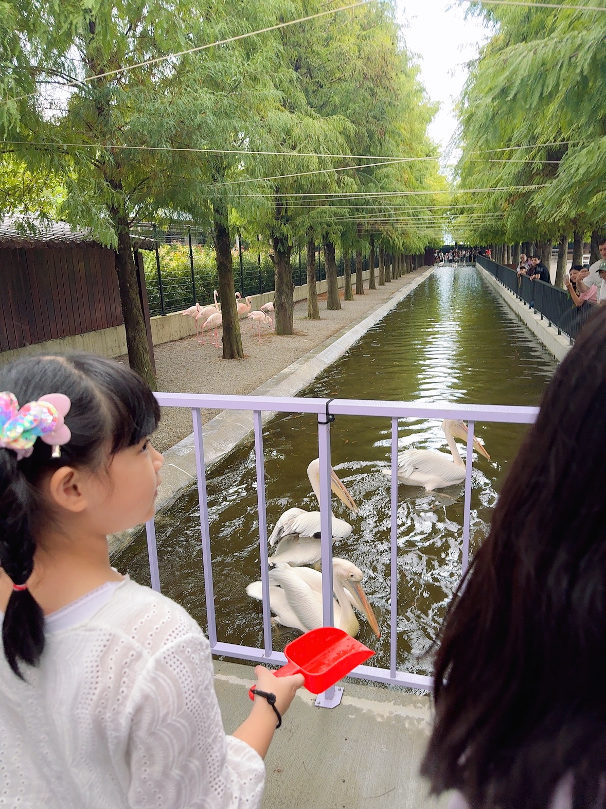 別忘了旁邊長長的水道,還有鵜鶘餵食秀活動可以玩!近距離餵食,旁邊還有紅鶴向我們行注目禮